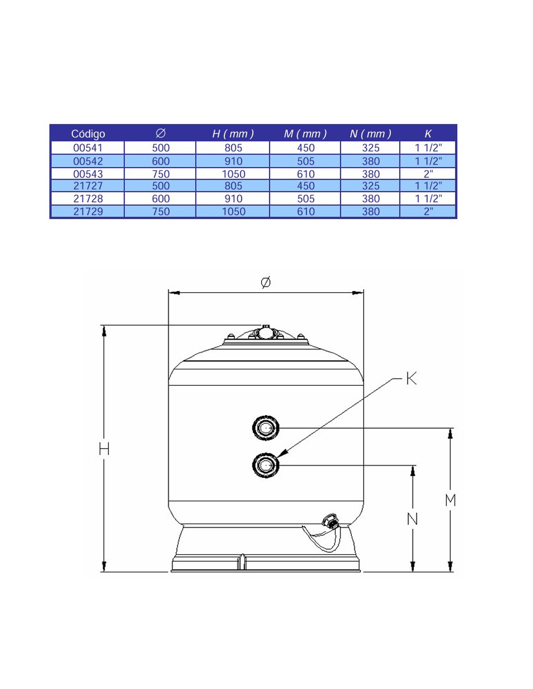 Filtro bobinado en resina de poliester y fibra de vidrio, con tapa D-230 mm de cierre por tornillos, inyectada. Equipado con purga de aire y agua manuales y manómetro y válvula selectora lateral. Compatible con arena y vidrio.