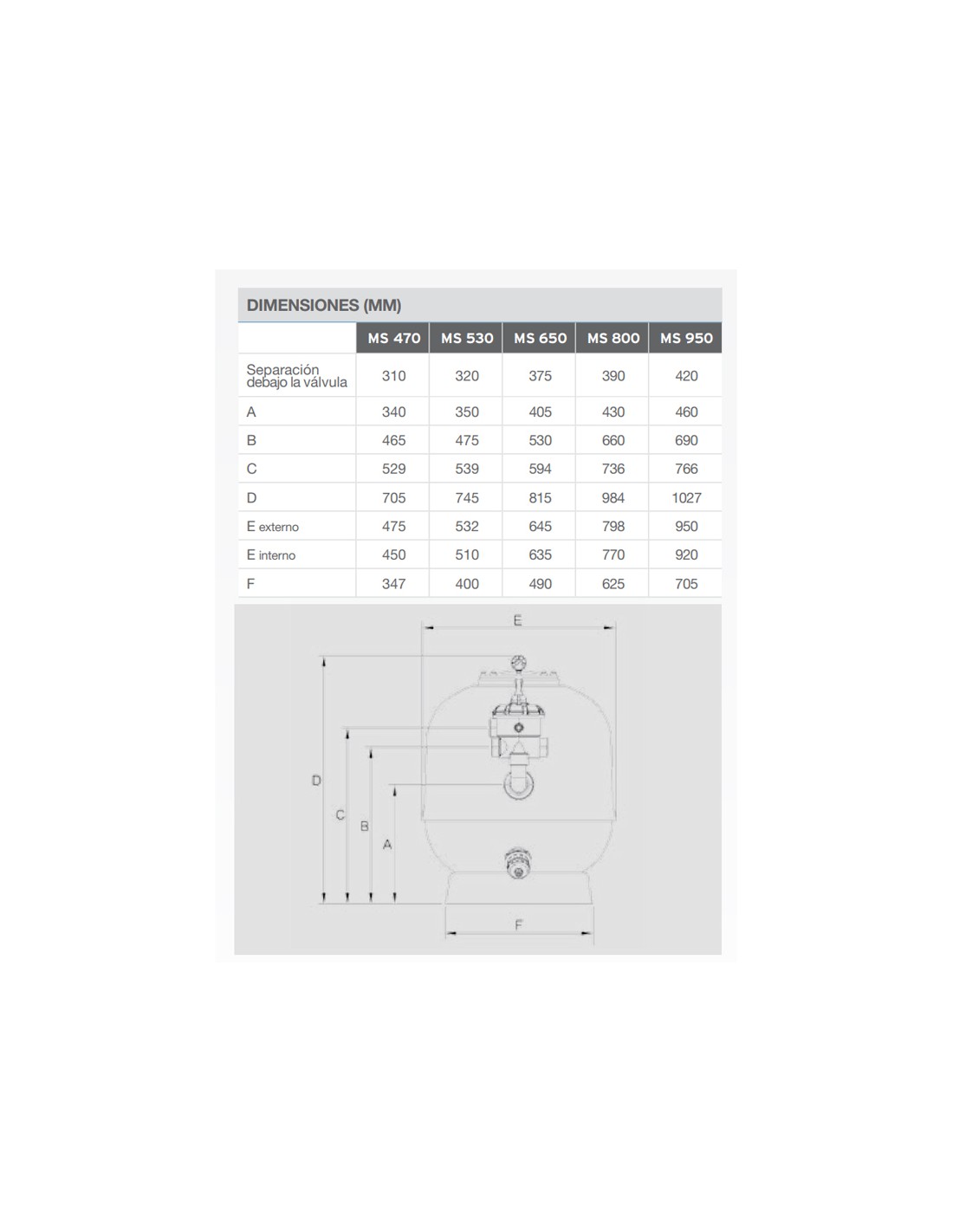 Filtro piscina MS 470, eficiente y duradero. Fabricado con cuerpo reforzado, tapa transparente para ver el interior del filtro, valvula de drenaje doble para un vaciado mas facil y valvula selectora lateral de 6 posiciones.