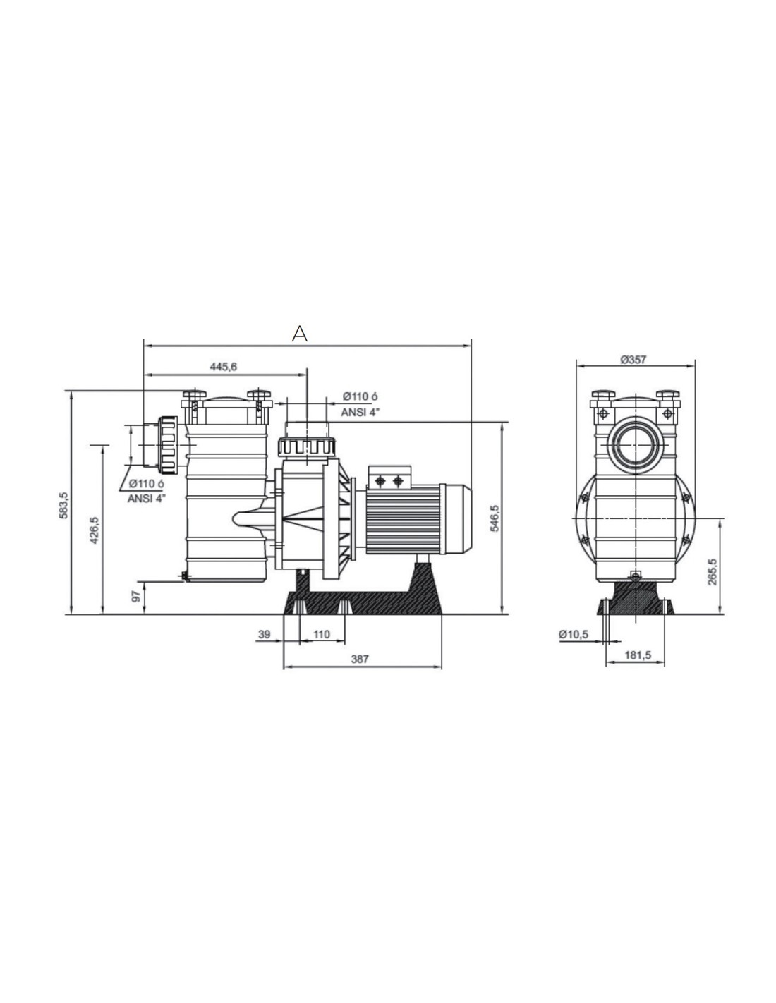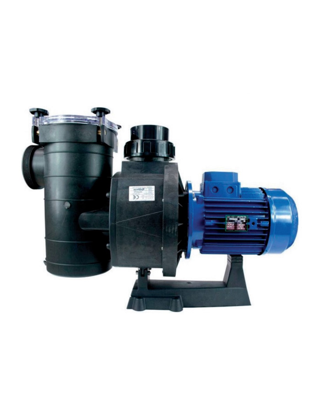 Bomba Kalifornia centrifuga autoaspirante para piscinas residenciales. Fabricada con cuerpo bomba inyectado en noryl, cestillo en plastico, turbina en noryl/FV, tapa transparente con cierre mediante 4 palomillas y motor con proteccion IP55.