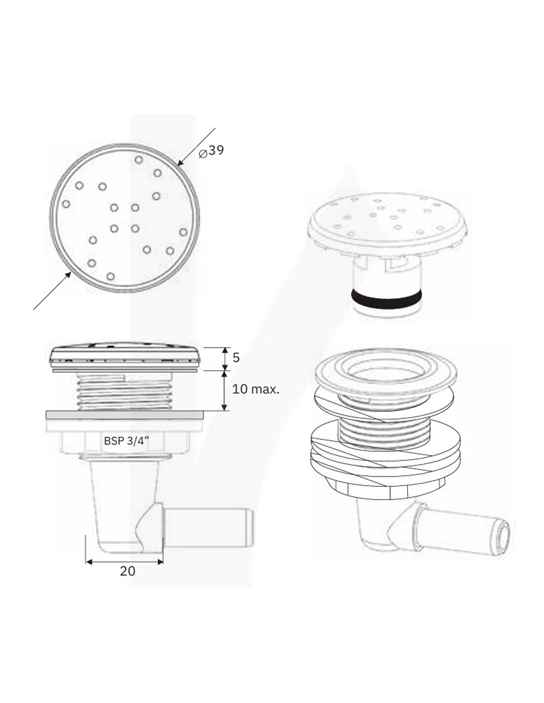 Boquilla difusora de aire fabricada en ABS roscada de medio-alto caudal para instalación de sistemas de hidromasaje en vaso de poliester, fibra de vidrio y otros prefafricados de hasta 10mm. de espesor.