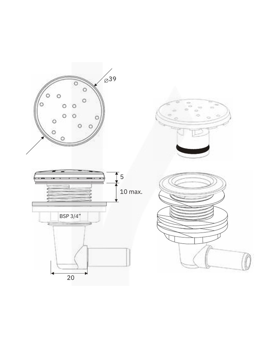 Boquilla difusora de aire fabricada en ABS roscada de medio-alto caudal para instalación de sistemas de hidromasaje en vaso de poliester, fibra de vidrio y otros prefafricados de hasta 10mm. de espesor.