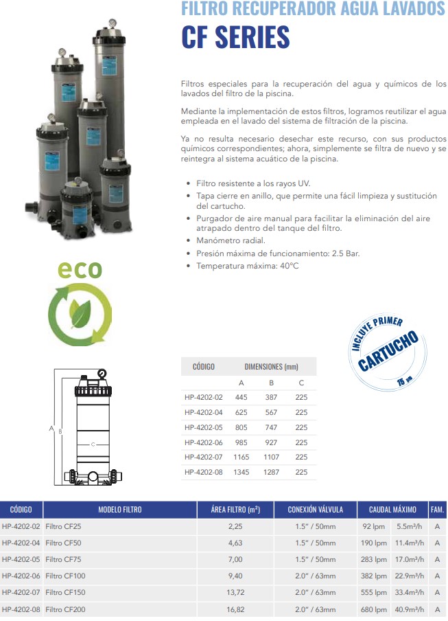 Filtro recuperador de agua, para instalacion en sala de maquinas de piscinas y spas.