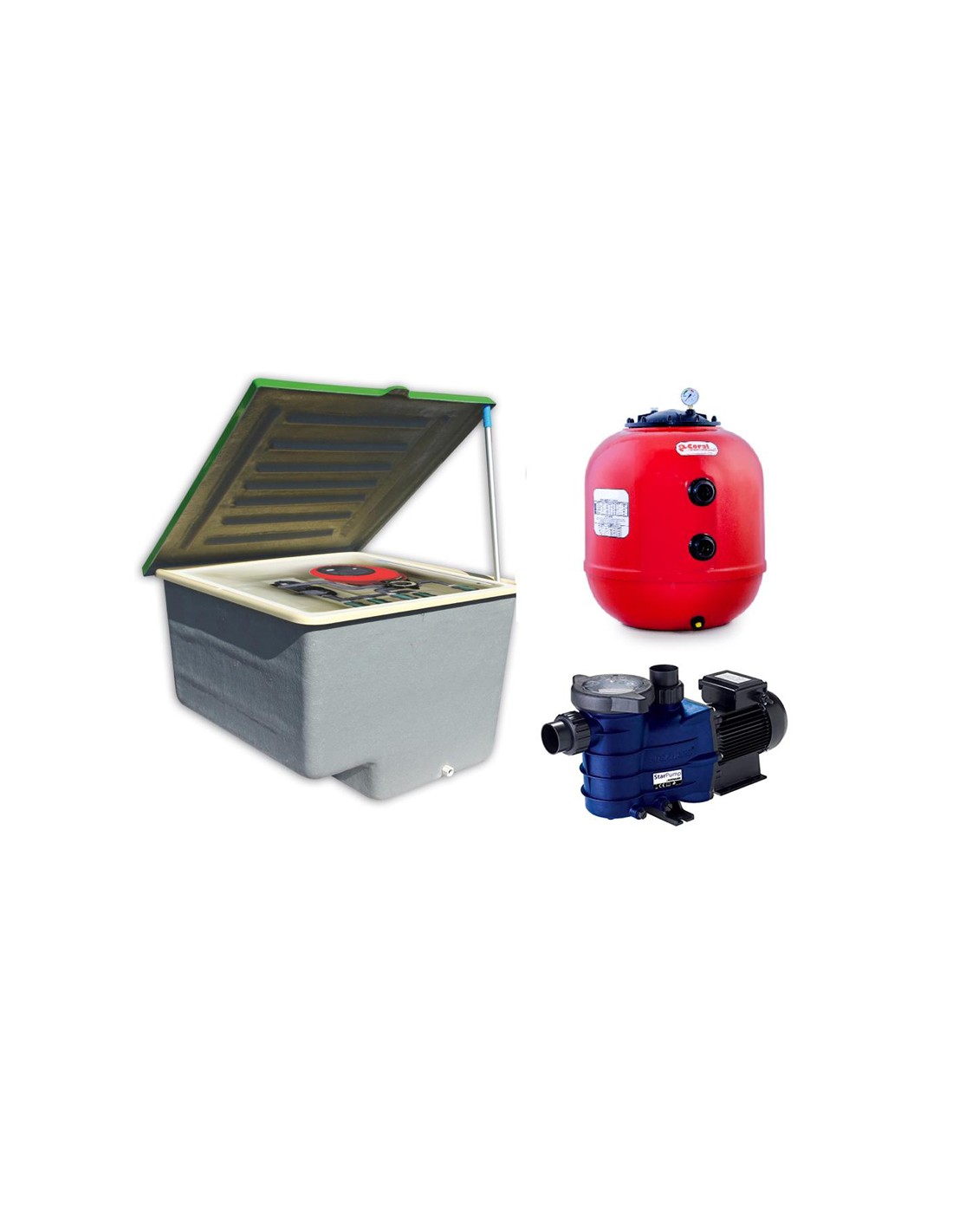 NOTA: Posibilidad de sumistrar con cloracion salina, control de pH, control de RX, wifi, cuadro electrico y valvulas para llenado de piscina y suministro de agua para la ducha, para recibir una oferta con este material montado, escribanos un email a info@recambiosdepiscinas.com indicando el material que desee incorporar a la caseta. Carga filtrante no incluida. El color del filtro puede ser rojo o blanco dependiendo del stock en el momento.