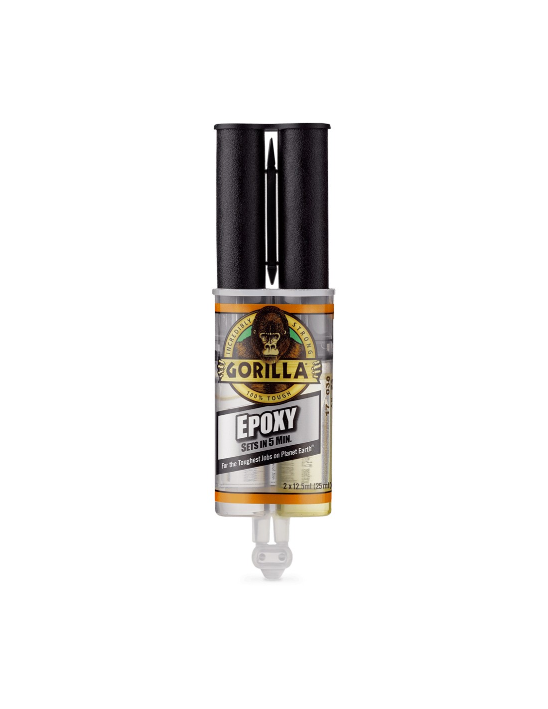 Gorilla Epoxi ofrece una unión fuerte y duradera tanto para reparaciones domésticas como de vehículos. La pistola fácil de usar dispensa una cantidad igual de resina y endurecedor, que cuando se mezclan crean una unión permanente, duradera y resistente al agua. La fórmula rellenadora de dos componentes Gorilla Epoxi se endurece en 5 minutos y une fácilmente acero, aluminio, vidrio, madera, cerámica, ladrillo y la mayoría de los plásticos.* Además, se seca con un color transparente, lo que garantiza un acabado perfecto de su proyecto. * No recomendando para su uso con polietileno o polipropileno o materiales similares