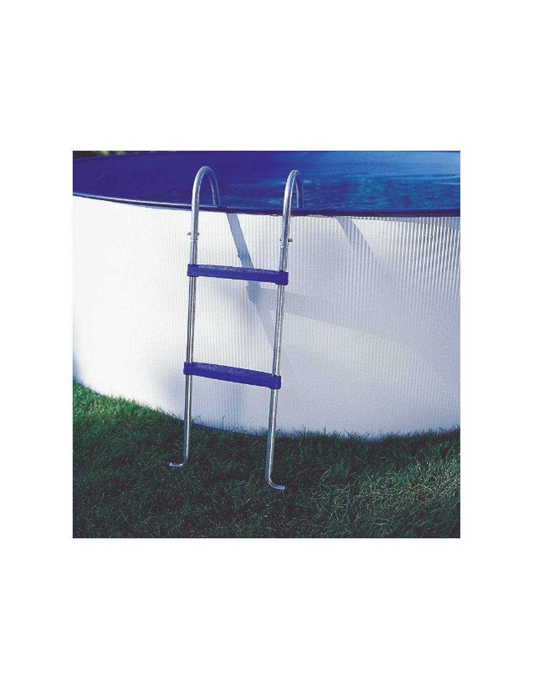 Escalera de acero galvanizado estandar tipo tijera con plataforma, fabricada en acero galvanizado y peldaños polipropileno, 2x2 peldaños antideslizantes, apta para piscinas desmontables.
