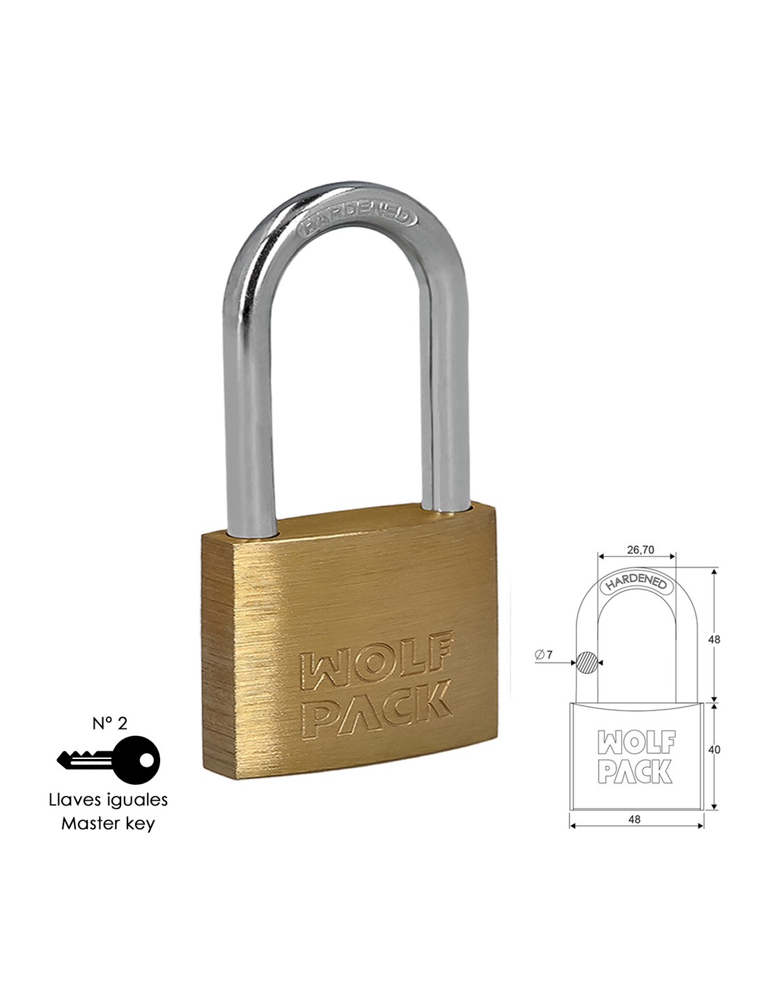 Candado laton arco largo llaves iguales nº2.