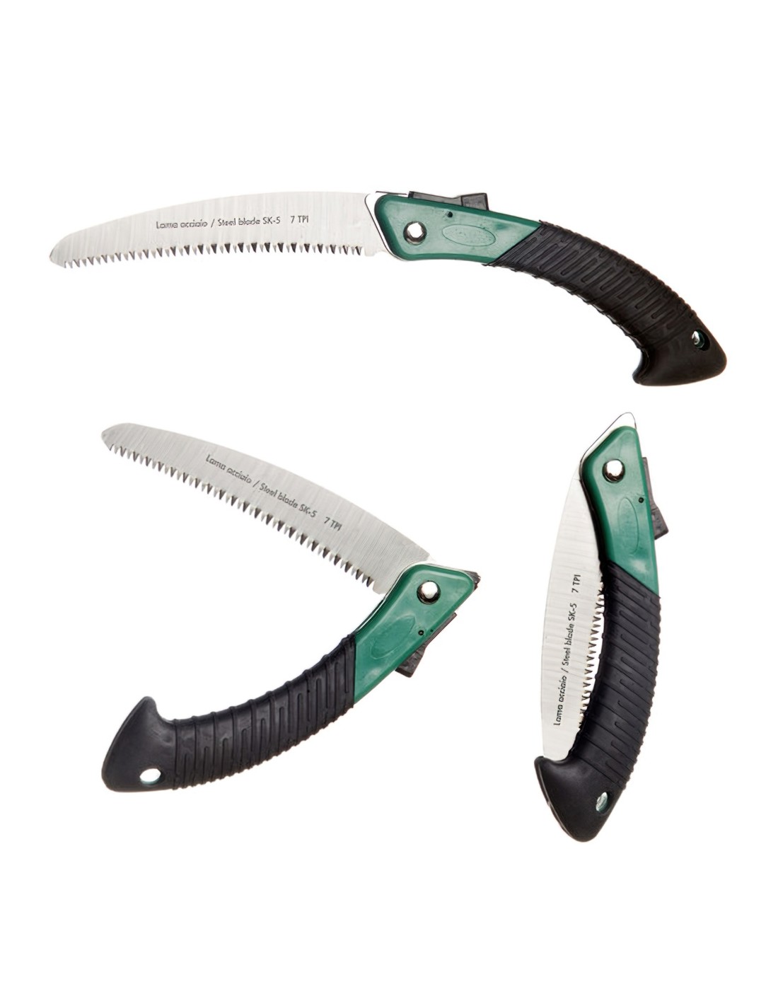 - Medida hoja: 180 mm. Hoja realizada en acero templado con alto porcentado de carbono. Acero SK 5. Diseño especial de los dientes hace que el afilado sea superfluo.