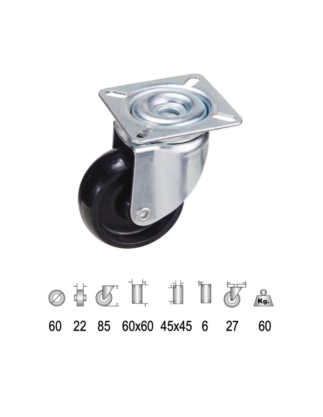 Rueda Domestica Poliamida Negra Placa 60 mm.