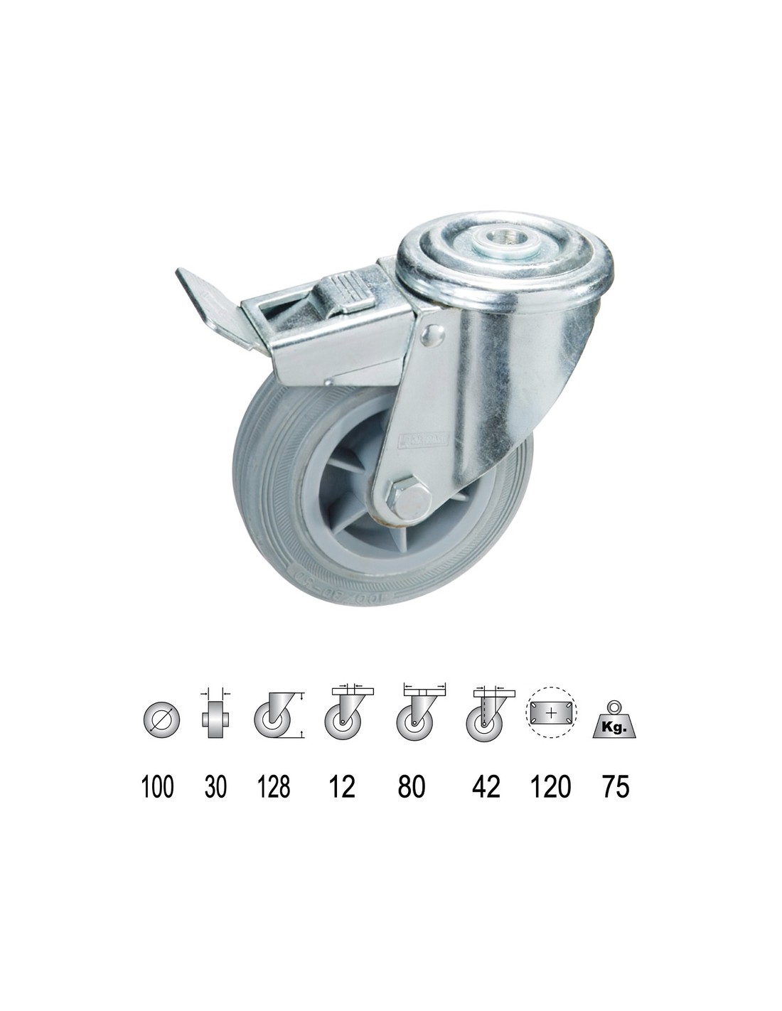 Rueda Industrial Goma Gris Pasante con freno100 mm.