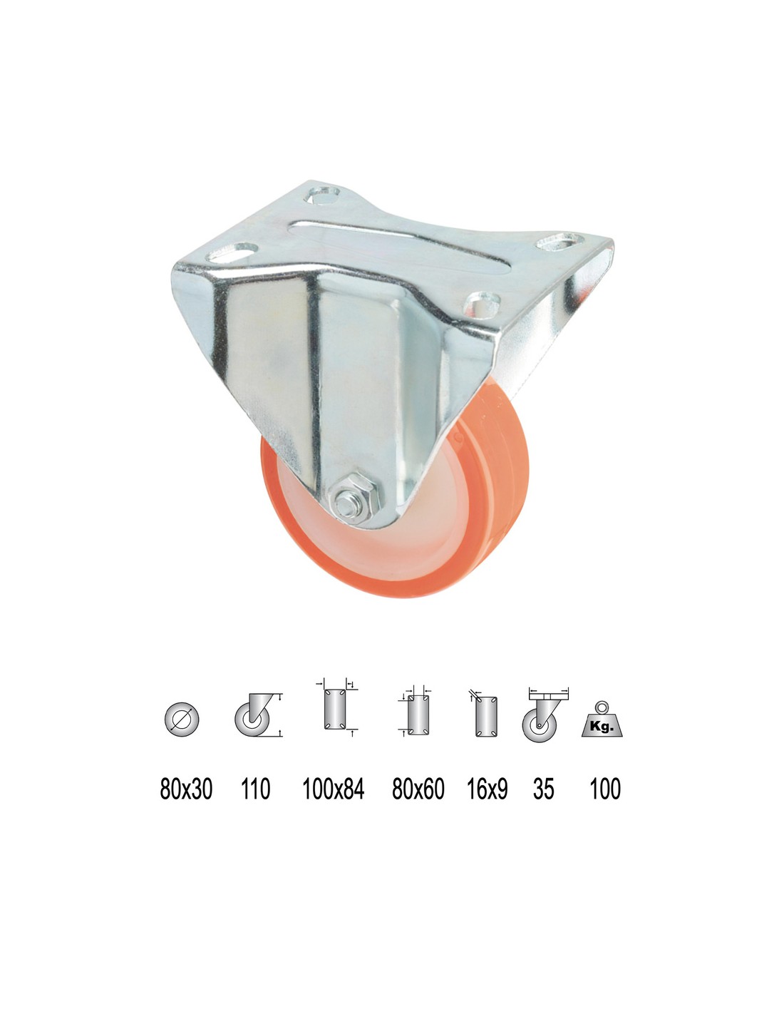 Rueda Industrial Poliuretano Fija   80 mm.