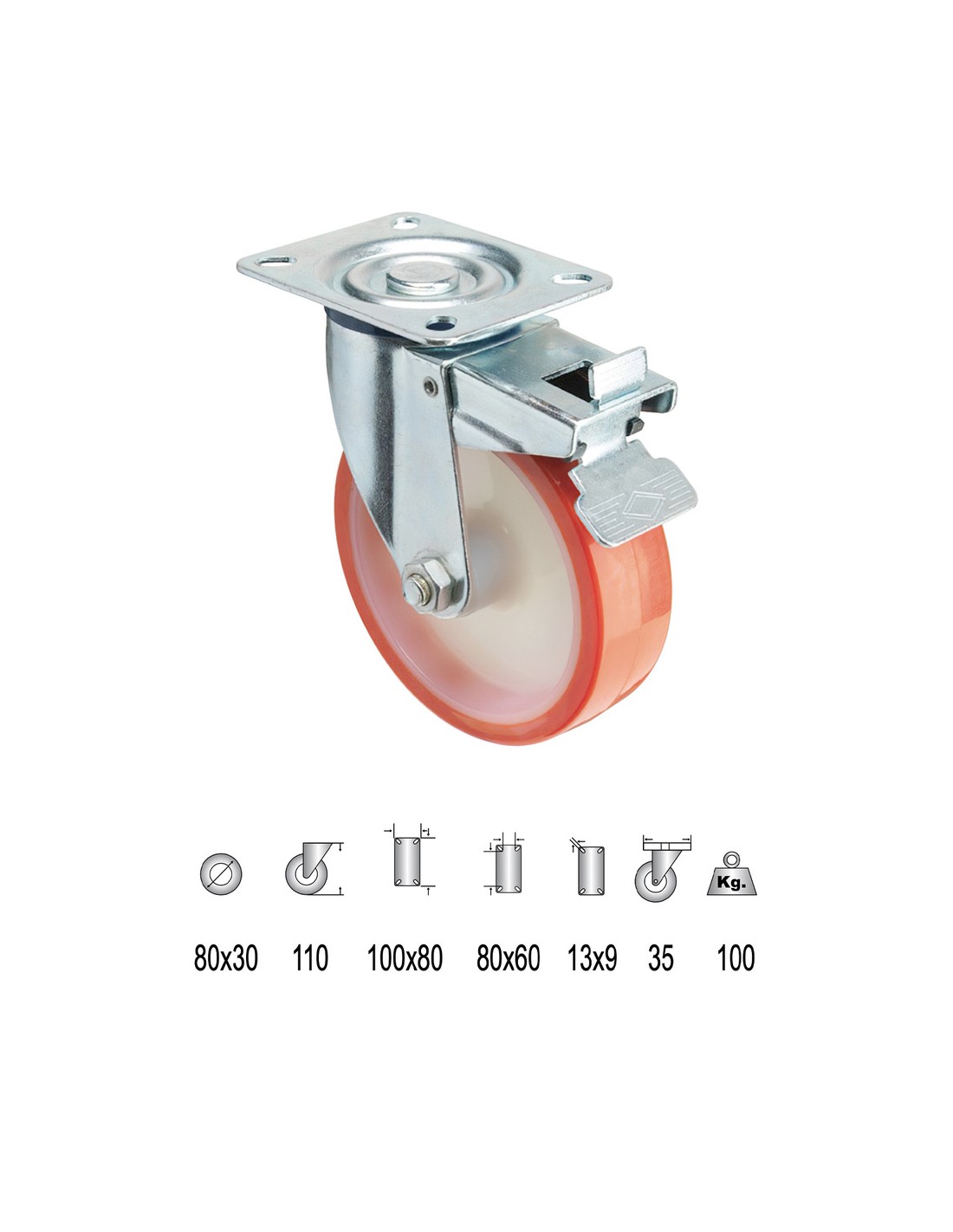 Rueda Industrial Poliuretano Placa con freno   80 mm.