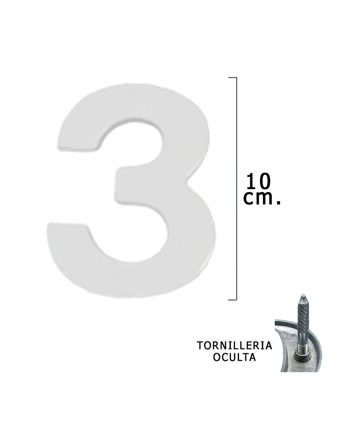 Numero Metal "3" Plateado Mate 10 cm. con Tornilleria Oculta (Blister 1 Pieza)