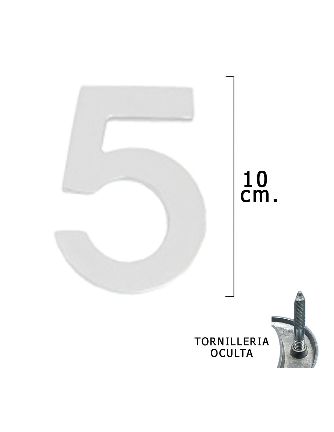 Numero Metal "5" Plateado Mate 10 cm. con Tornilleria Oculta (Blister 1 Pieza)
