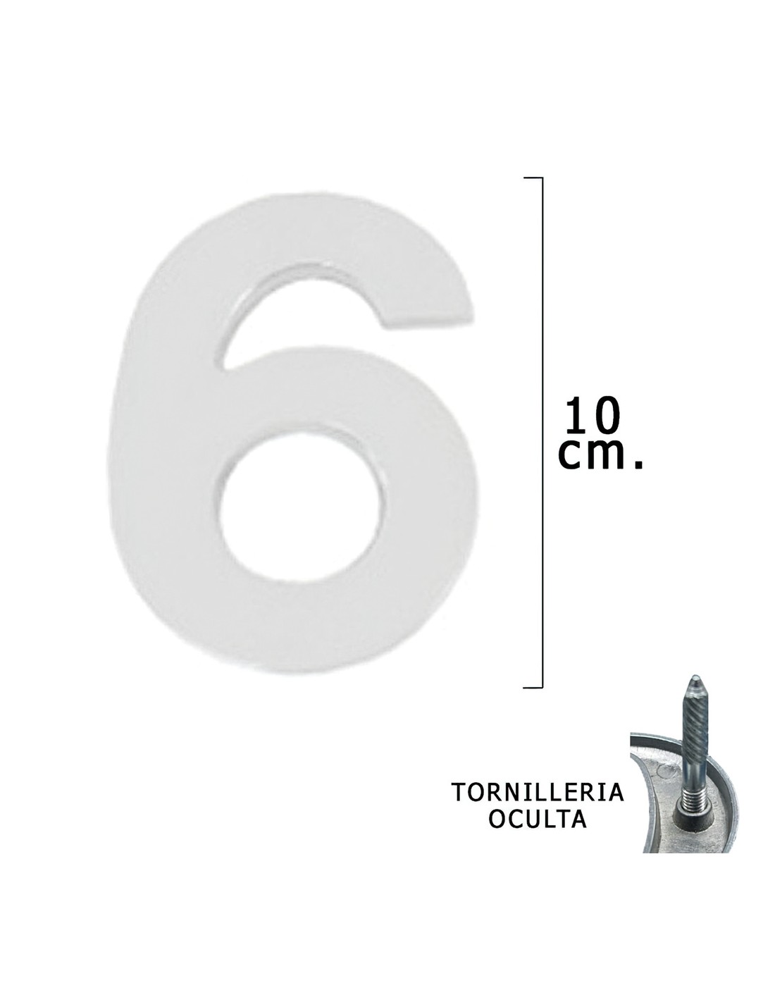 Numero Metal "6" Plateado Mate 10 cm. con Tornilleria Oculta (Blister 1 Pieza)