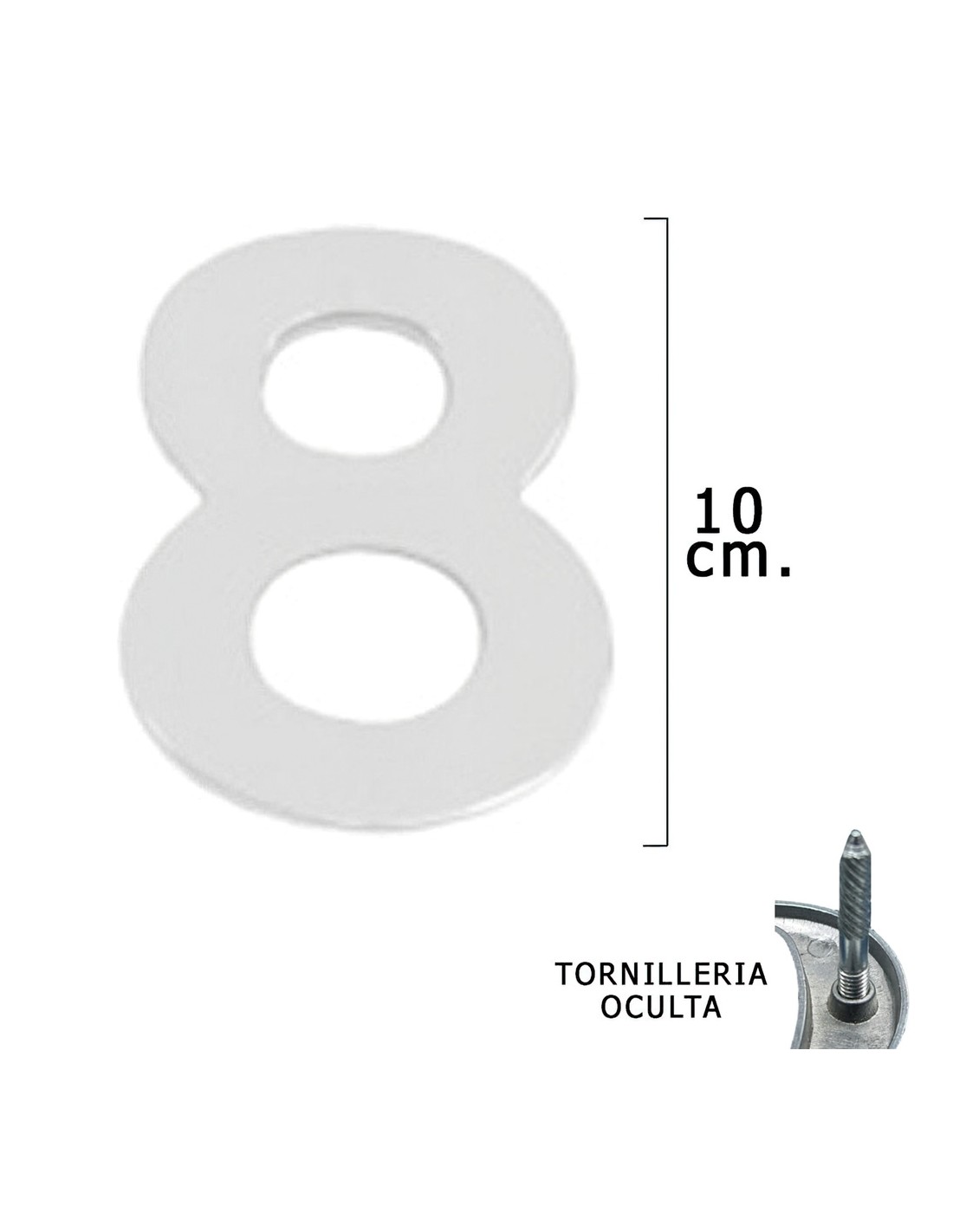 Numero Metal "8" Plateado Mate 10 cm. con Tornilleria Oculta (Blister 1 Pieza)