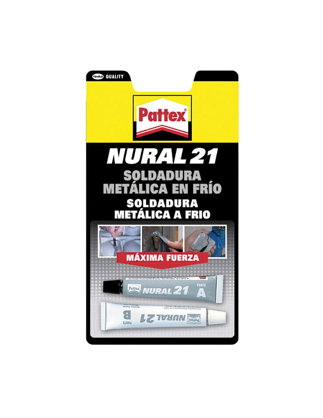 - No contiene disolventes y no altera su volumen al endurecer. Color del producto: gris. Los tiempos de mezcla y manipulación pueden acelerarse si se mezcla gran cantidad de producto. Se adhiere a hierro, acero, acero inoxidable, acero cromado, acero niquelado, aluminio, cobre, latón, estaño y plomo. También es adecuado para vidrio, cristal, fibra de vidrio, plásticos, madera, mármol y cemento. Pattex Nural 21 pega, repara y rellena de forma permanente. Una vez endurecido puede ser lijado, pulido, tratado, mecanizado y pintado. Resulta idóneo para tapar grietas y tuberías, depósitos y piezas metálicas.