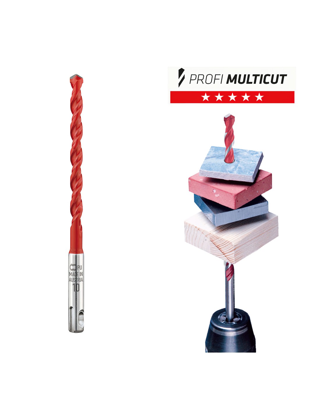 - Perfil cuádruple escalonado patentado, Rápida eliminación de los detritos durante el taladrado en mampostería y hormigón.