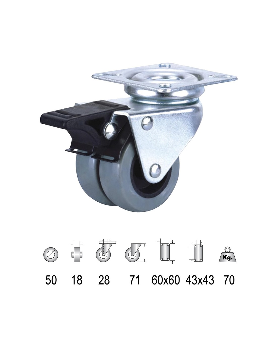 Rueda Doméstica Doble Poliamida Gris Placa con freno   50mm