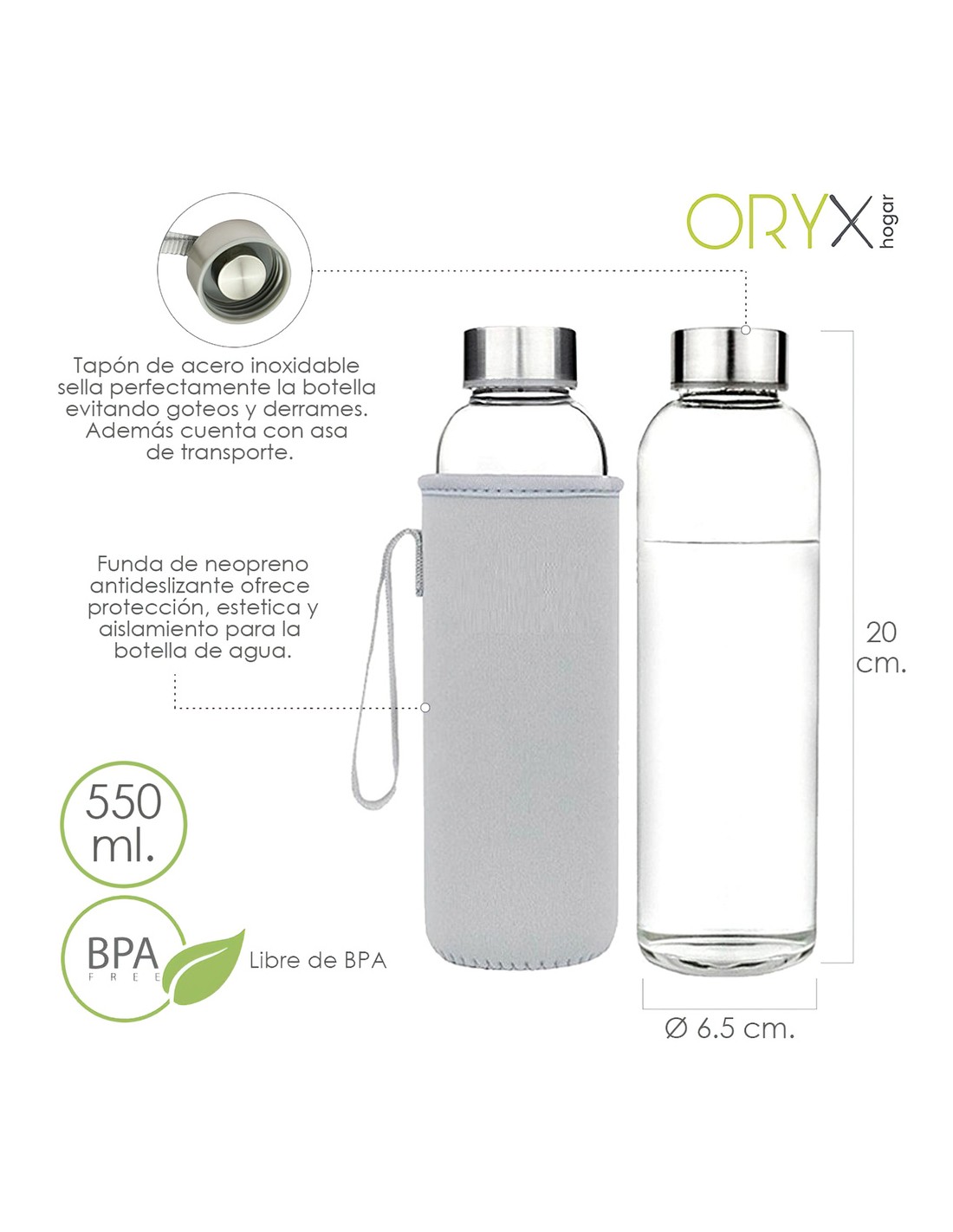 Botella Agua Cristal 550 ml. Funda Neopreno con Asa. Sin BPA