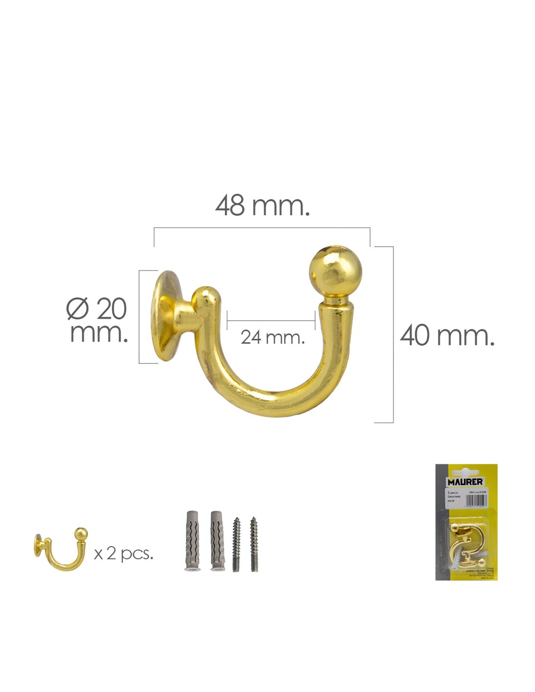 Gancho Latonado Atornillabe 48 mm. Con tacos y tornillos (Blister 2 piezas)