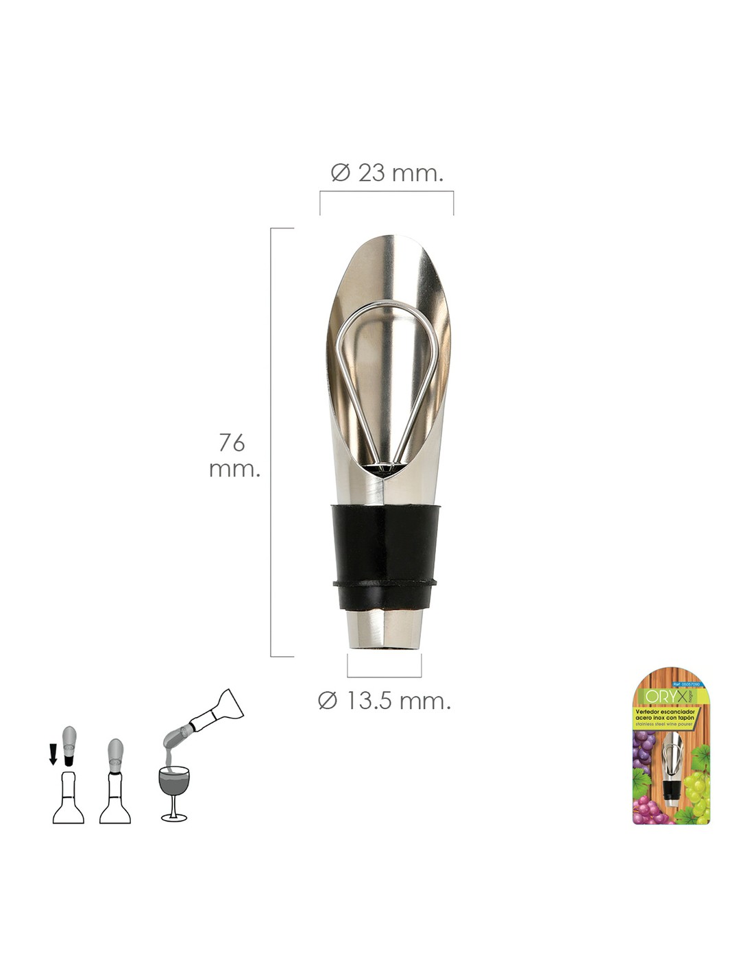 Vertedor escanciador vino acero inoxidable con tapón.