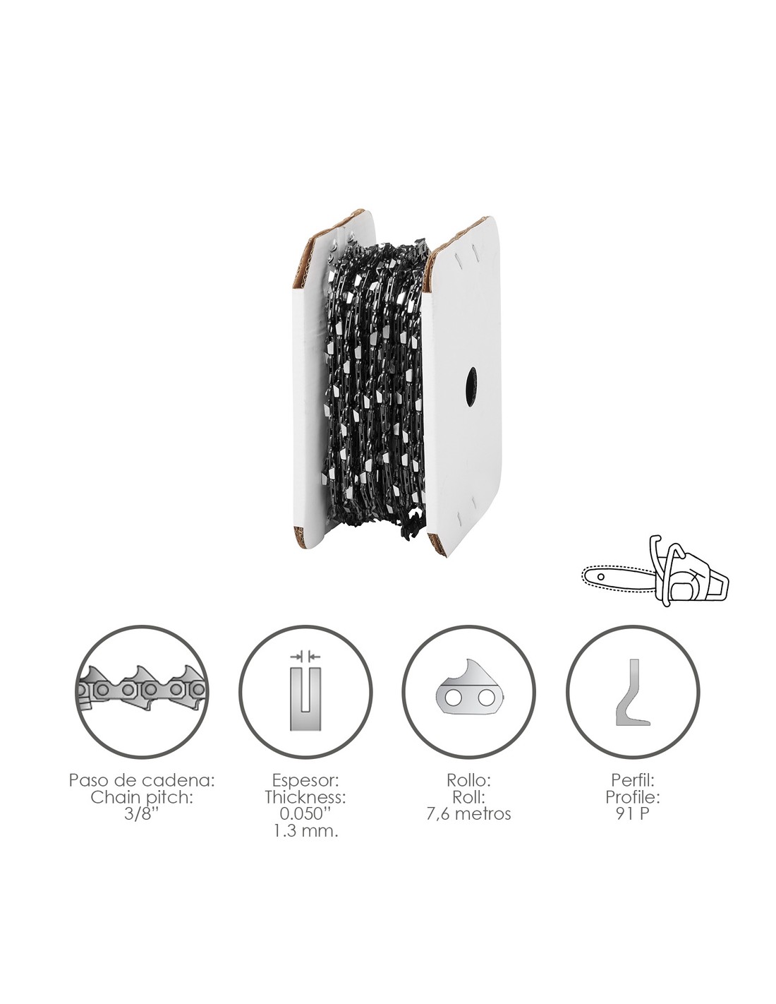 Cadena Motosierra 3/8" / 0.050" 1,3 mm. / 91 P / Rollo 7,6 metros.