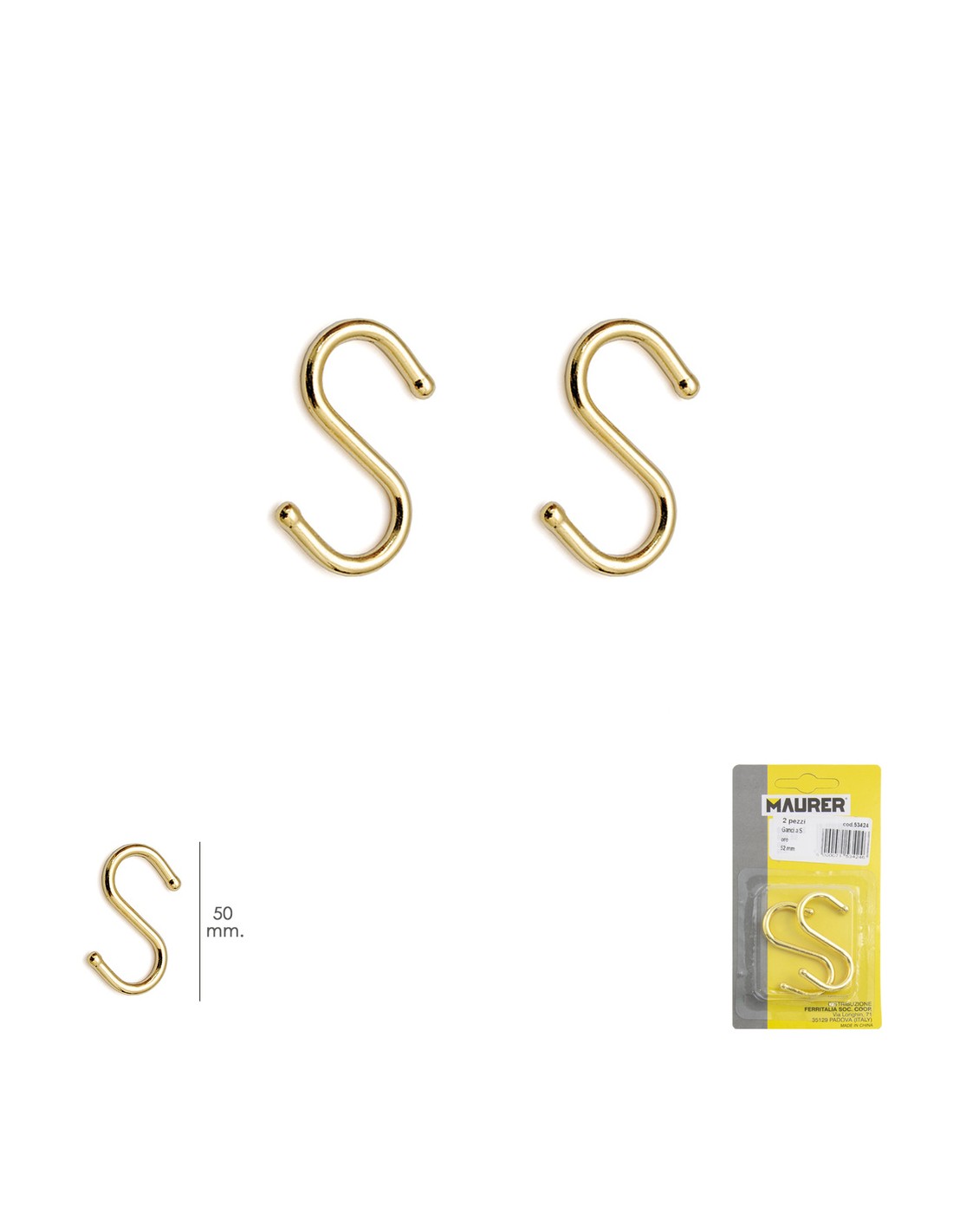 Gancho "S" 50 mm Dorado (Blister 2 piezas) Uso Domestico