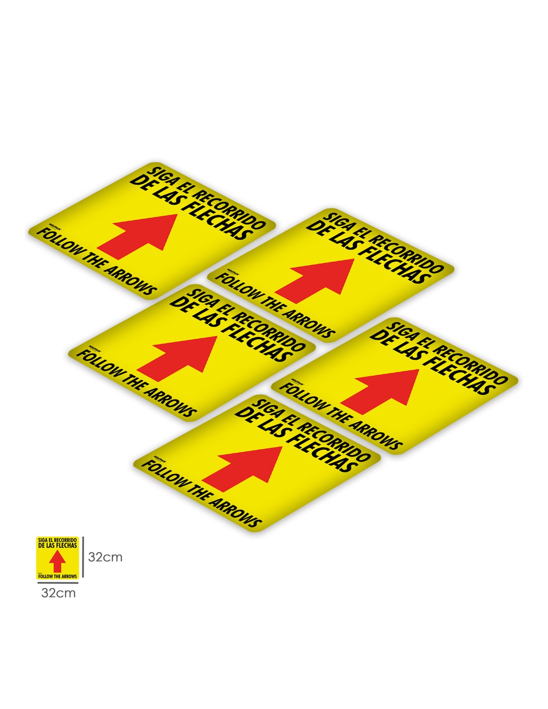 - Kit de 5 pegatinas de rotulación de suelo. Indica: "Siga el recorrido de las flechas". Rotuladas tanto en Castellano como en Ingles.