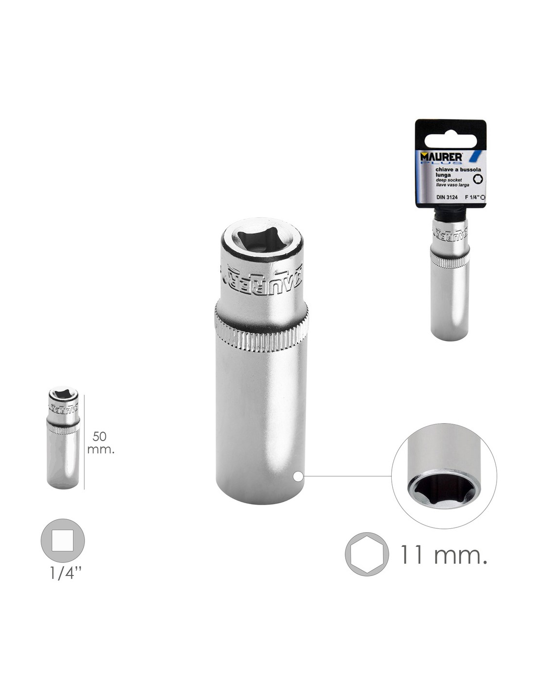 LLave Vaso Larga 1/4" / 11 mm. Hexagonal. / Longitud 50 mm. Realizada en Acero Cromo Vanadio