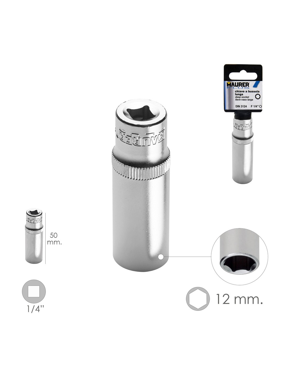 LLave Vaso Larga 1/4" / 12 mm. Hexagonal. / Longitud 50 mm. Realizada en Acero Cromo Vanadio