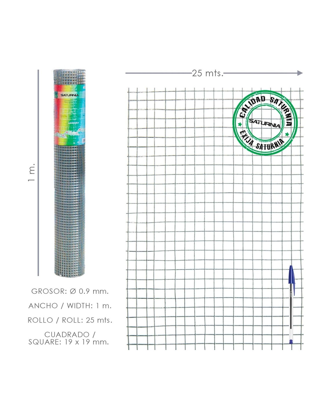 Malla Electrosoldada Ligera Galvanizada 19x19 Alto 100 cm. Rollo 25 Metros Uso Domestico