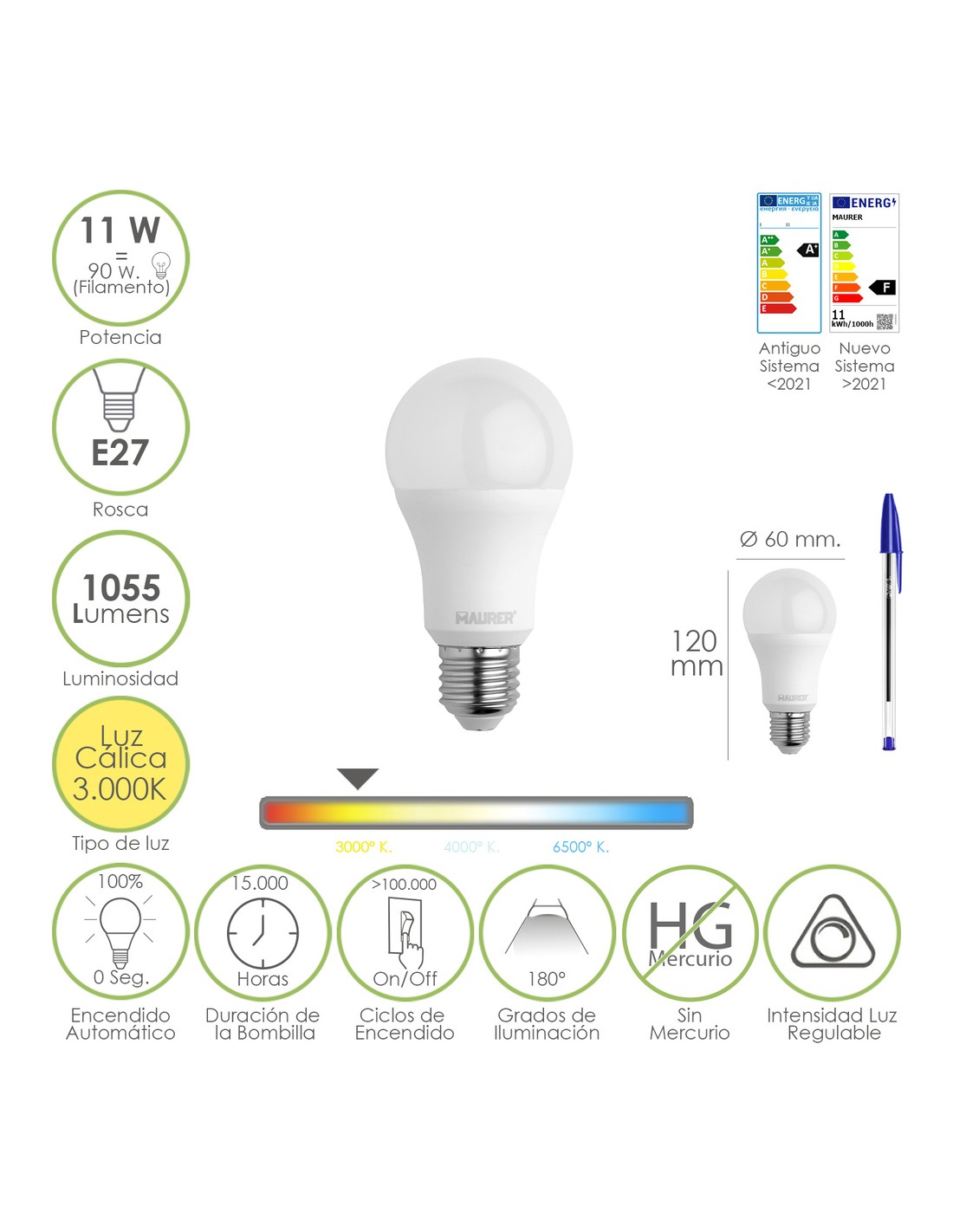 - Potencia: 11 W. equivalente a 90 W. aproximadamente de antigua incandescencia.