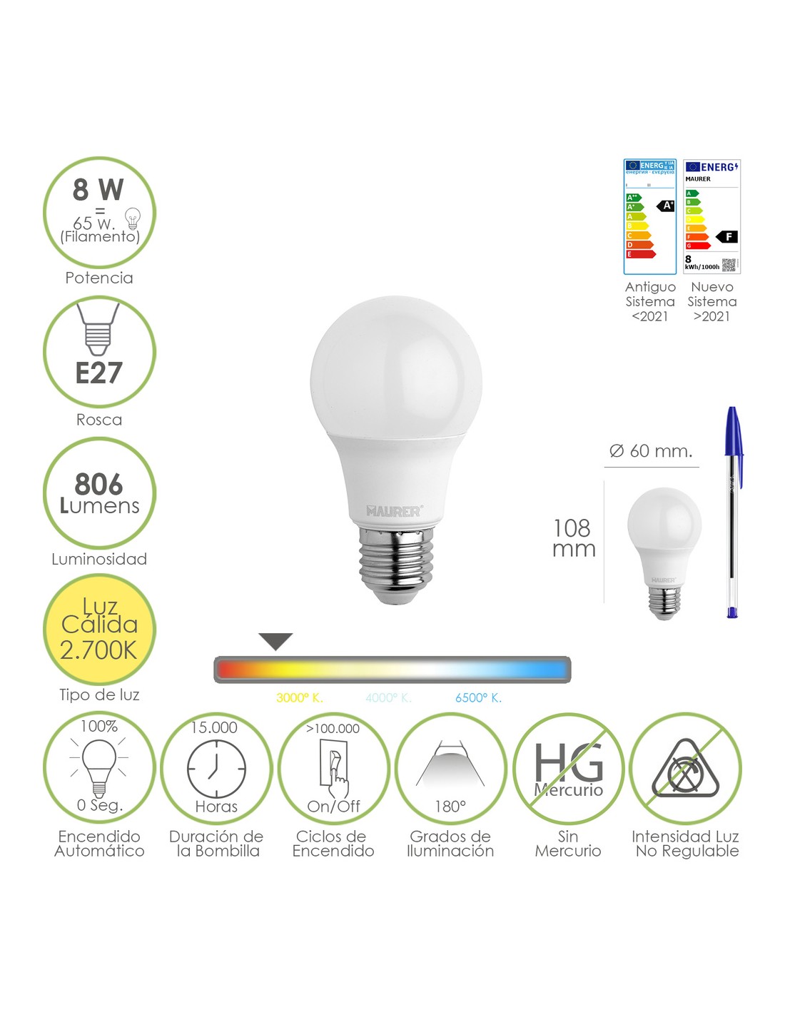 - Potencia: 8 W. equivalente a 65 W. aproximadamente de antigua incandescencia.