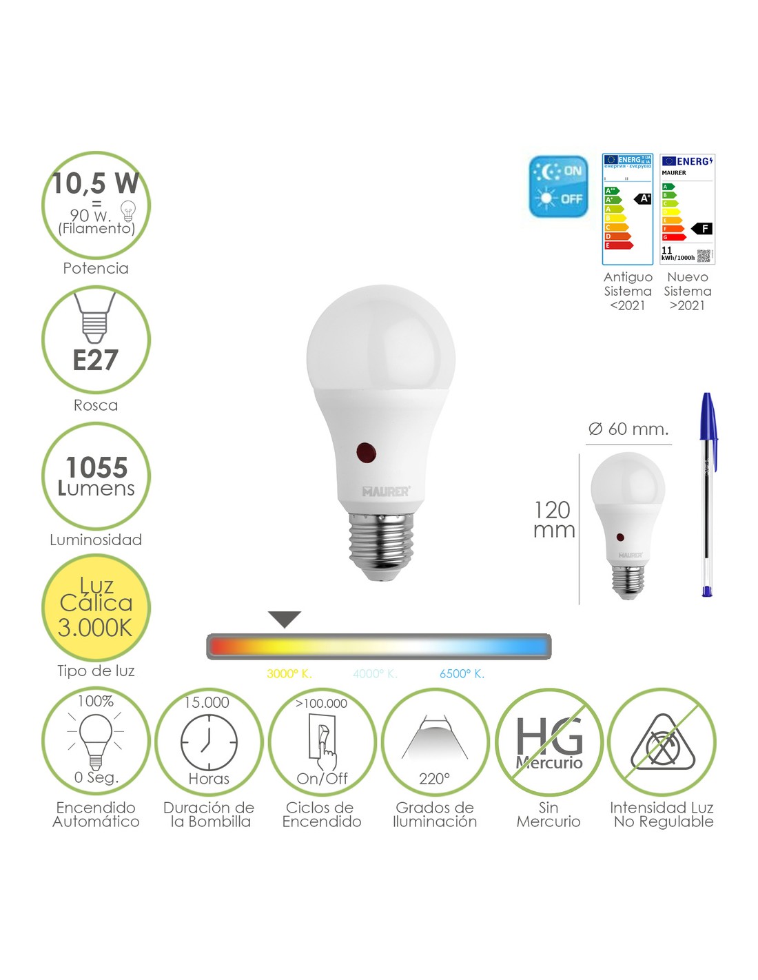 - Potencia: 10.5 W. equivalente a 90 W. aproximadamente de antigua incandescencia.