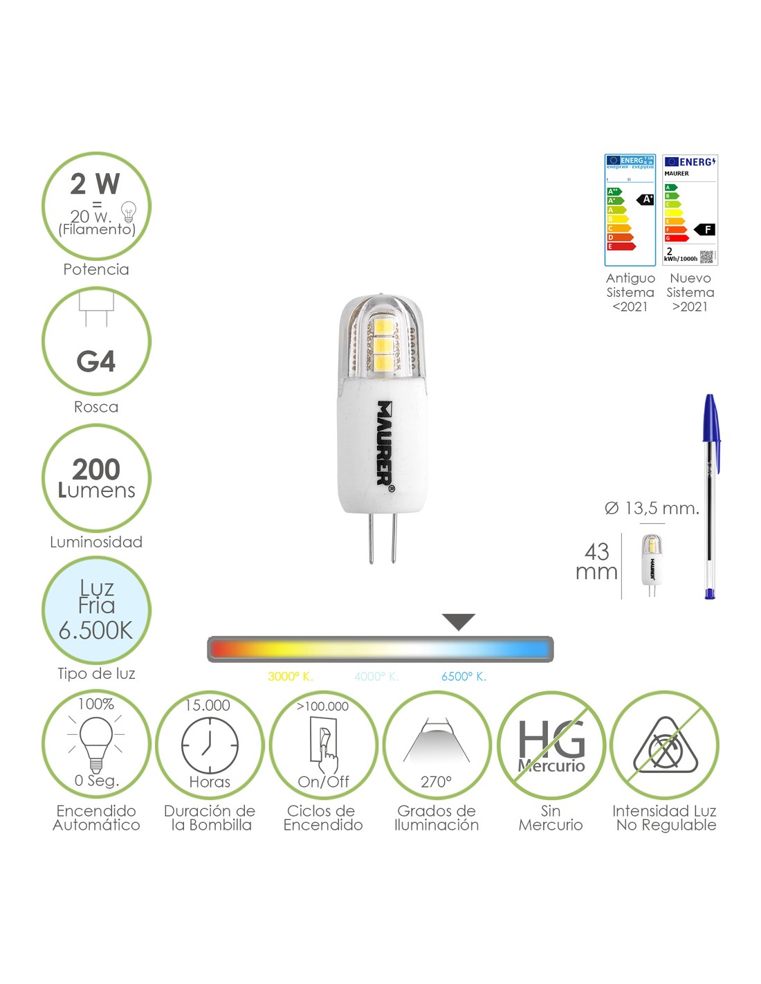 - Vida de la bombilla 15.000 horas.