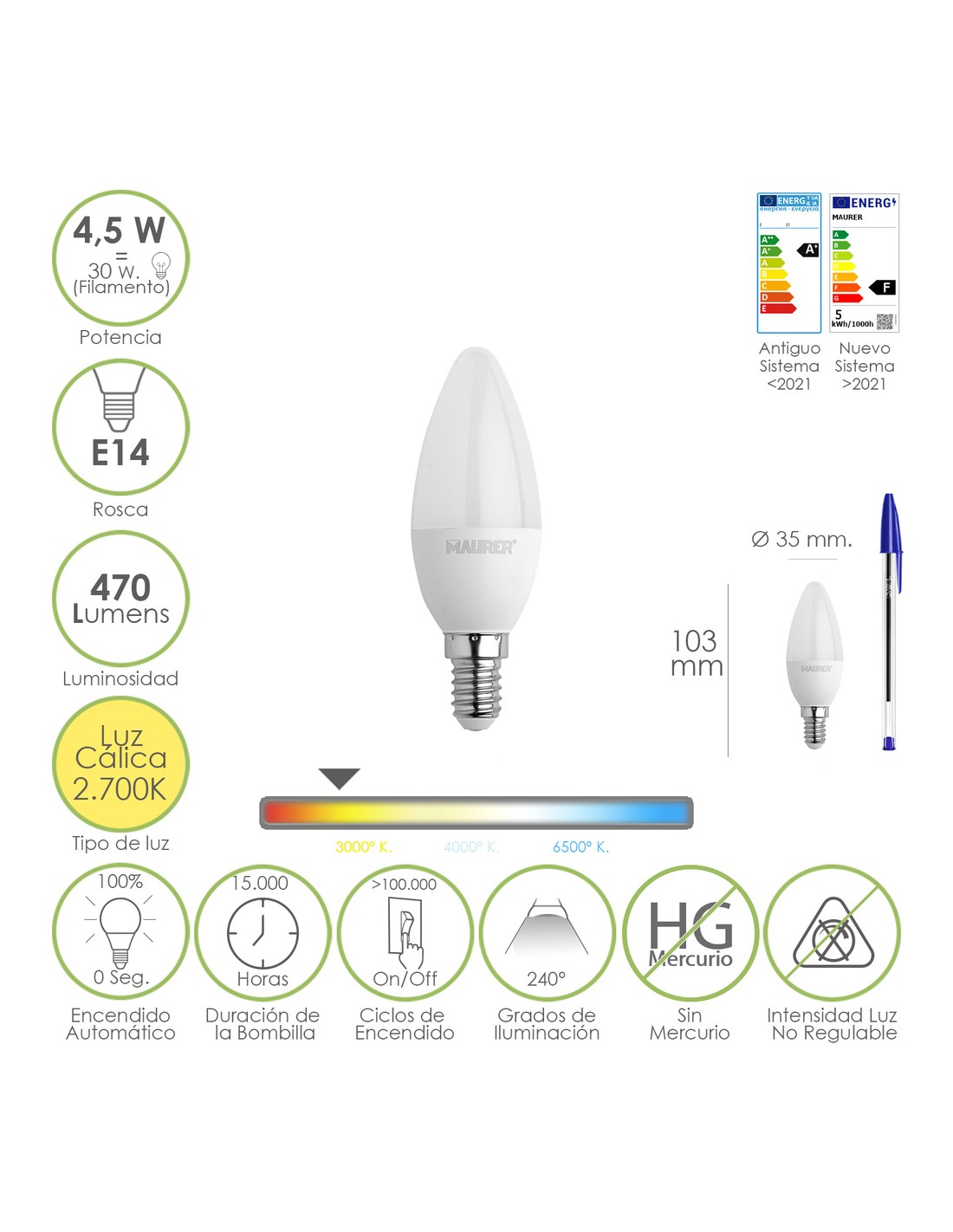 - Potencia: 4,5 W. equivalente a 35 W. aproximadamente de antigua incandescencia.