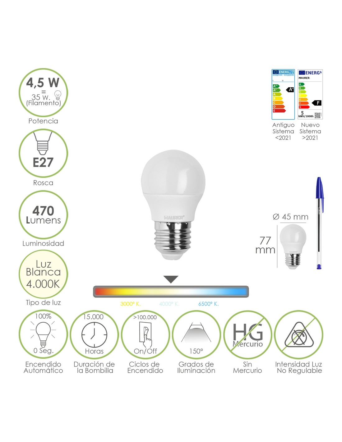 - Potencia: 4.5 W. equivalente a 55 W. aproximadamente de antigua incandescencia.