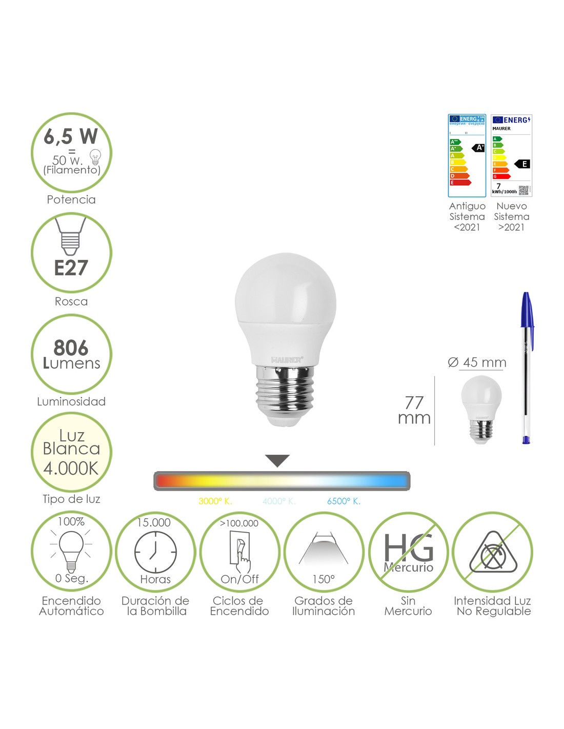 Bombilla Led Esfera Rosca E27. 6.5 Watt. Equivale A 50 Watt. 806 Lumenes. Luz Neutra 4000º K.