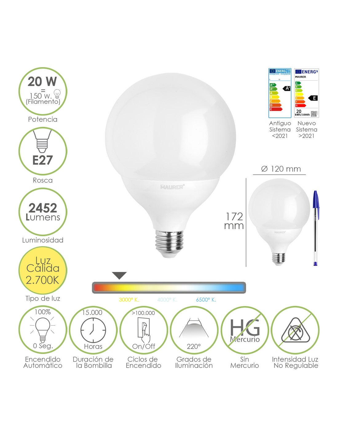 Bombilla Led Globo E27. 20 Watt. Equivale A 150 Watt. 2452 Lumenes. Luz Calida 2700º K.