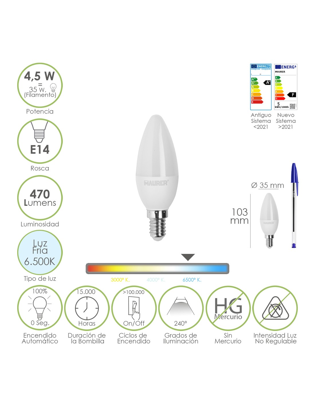 Bombilla Led Vela Rosca E14. 4,5 Watt. Equivale A 35 Watt. 470 Lumenes. Luz Fria (6500º K.)