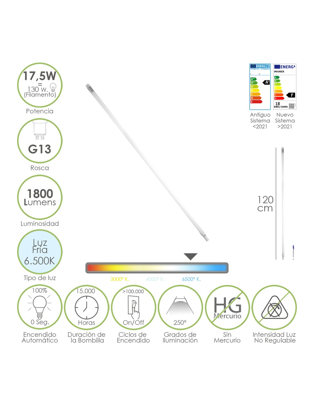 - Medida: 120 cm. Rosca: G13 / T8 Potencia: 17,5 W. equivalente a 130 W. aproximadamente de antigua incandescencia.