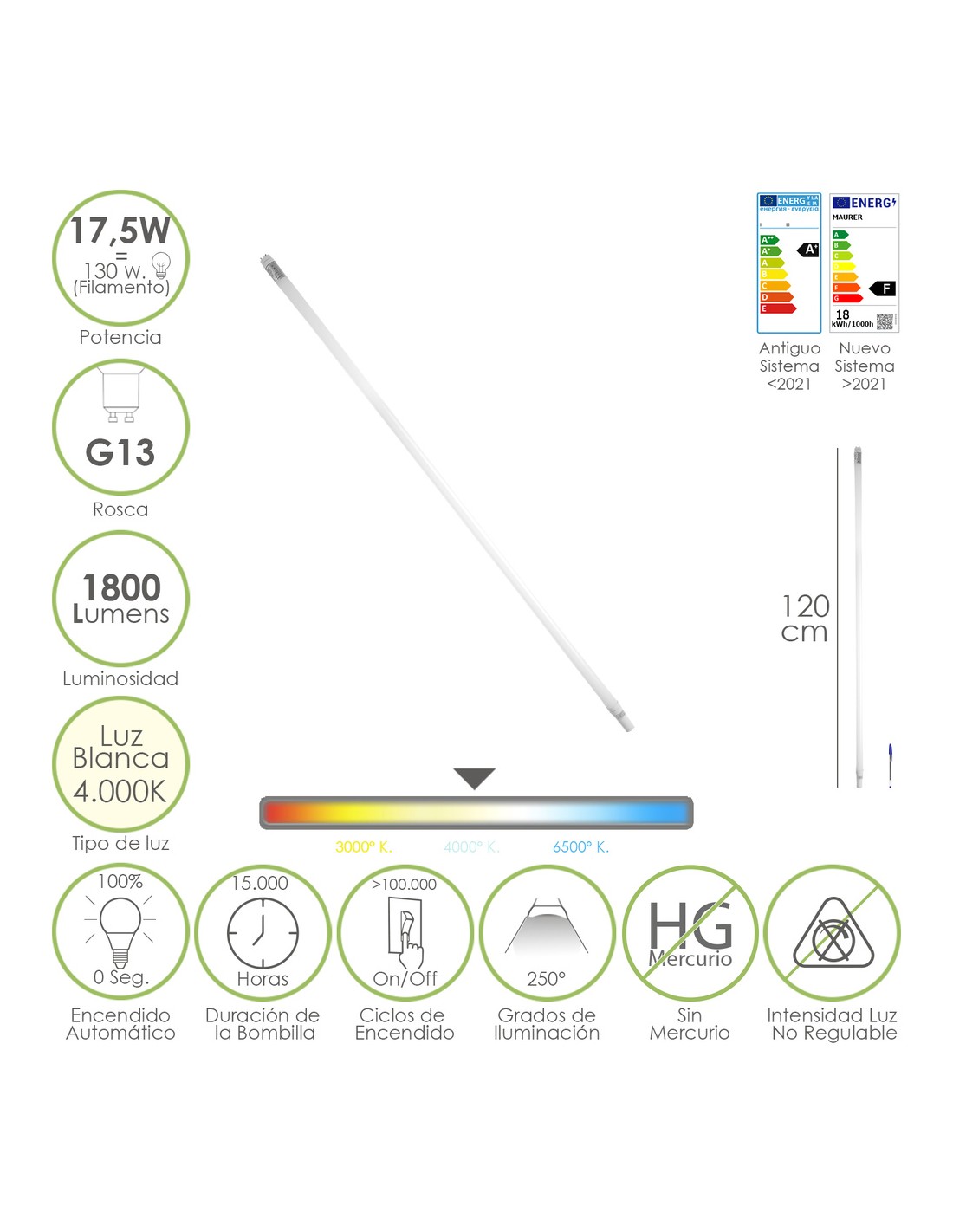 - 4000º K. (Kelvin), luz día, luz blanca, luz neutra.