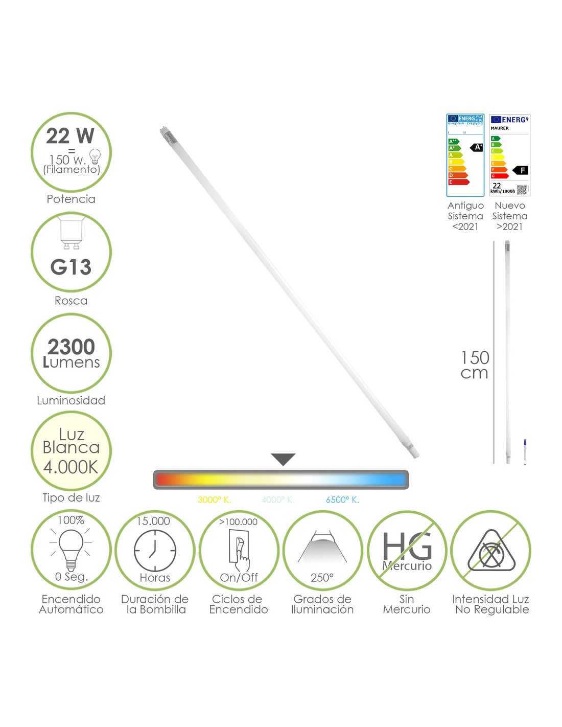 Tubo Led T8 150 cm. 22 Watt. Equivale A 150 Watt. 2300 Lumenes. Luz Neutra 4000º K.