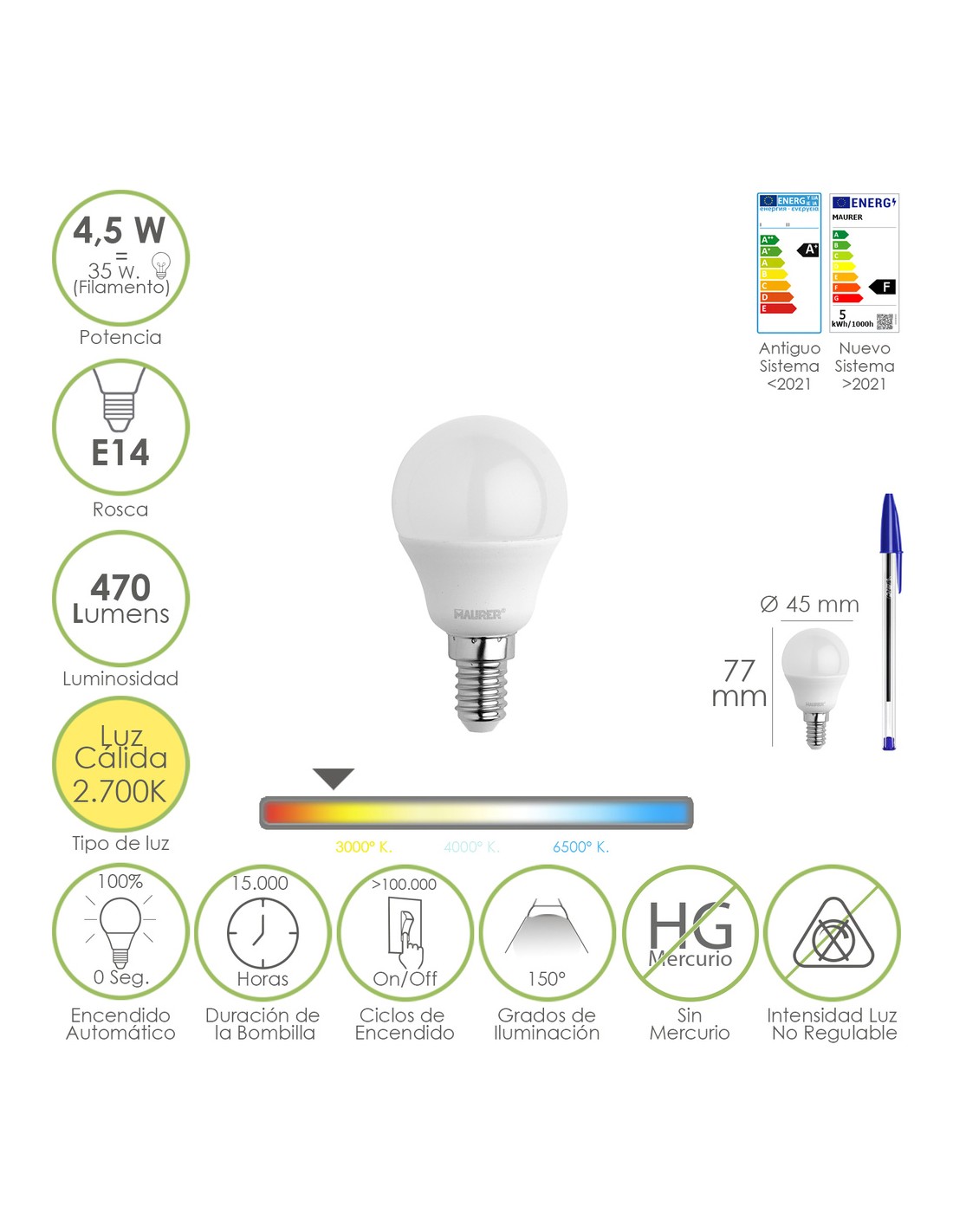 - Potencia: 4.5 W. equivalente a 35 W. aproximadamente de antigua incandescencia.