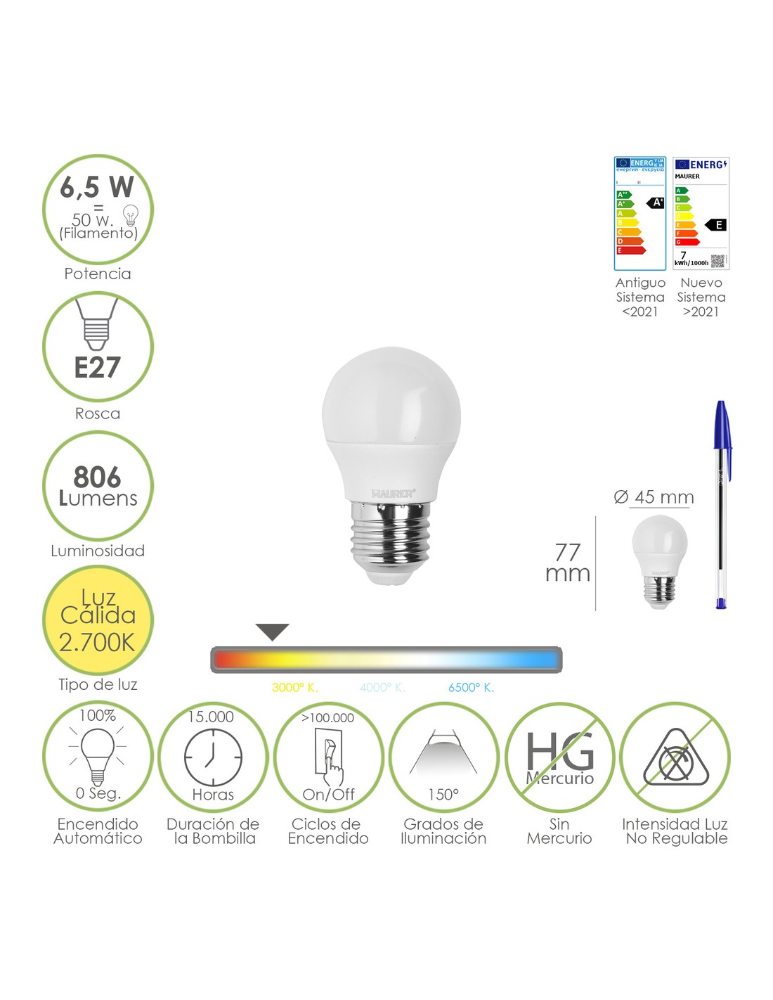 - Potencia: 6.5 W. equivalente a 50 W. aproximadamente de antigua incandescencia.