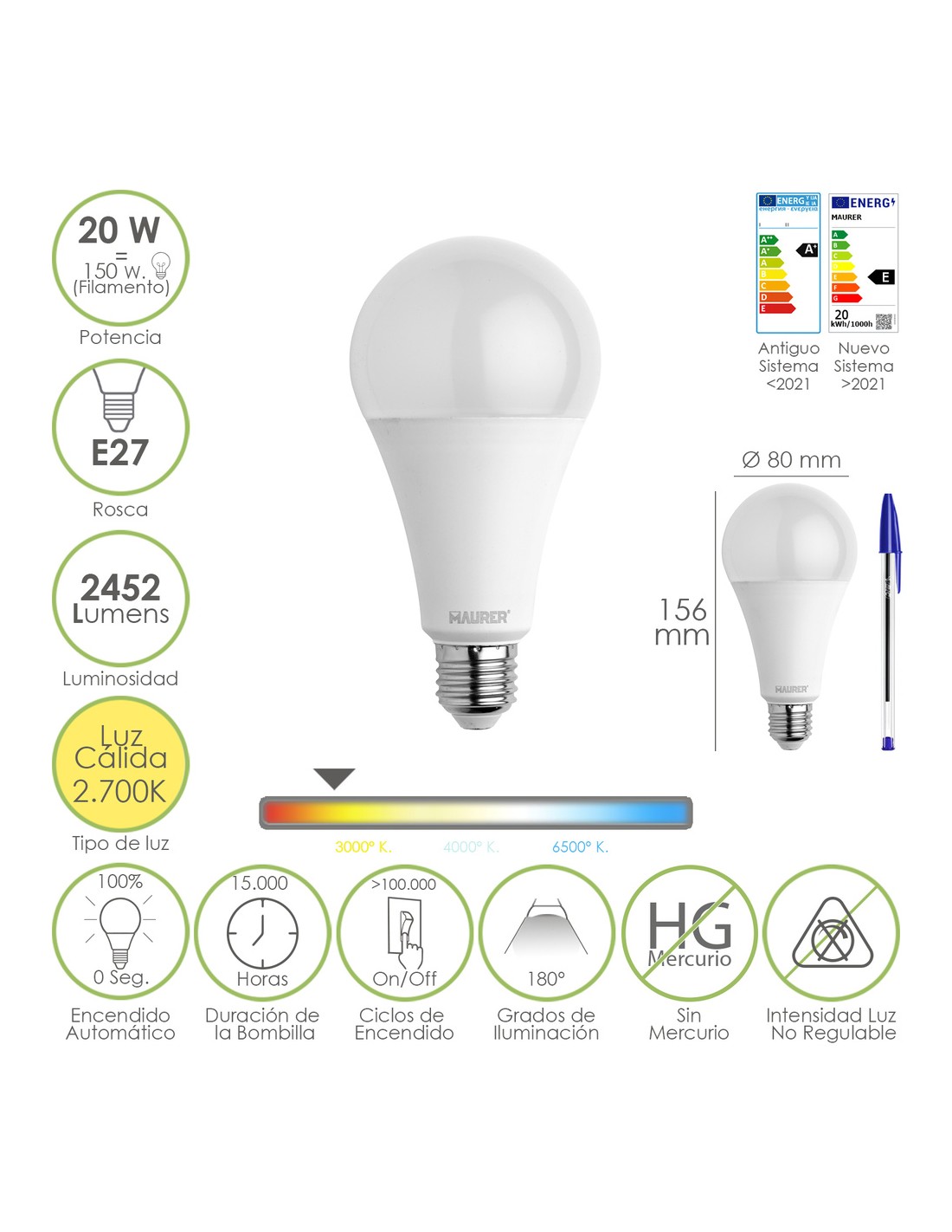 - Potencia: 20 W. equivalente a 150 W. aproximadamente de antigua incandescencia.