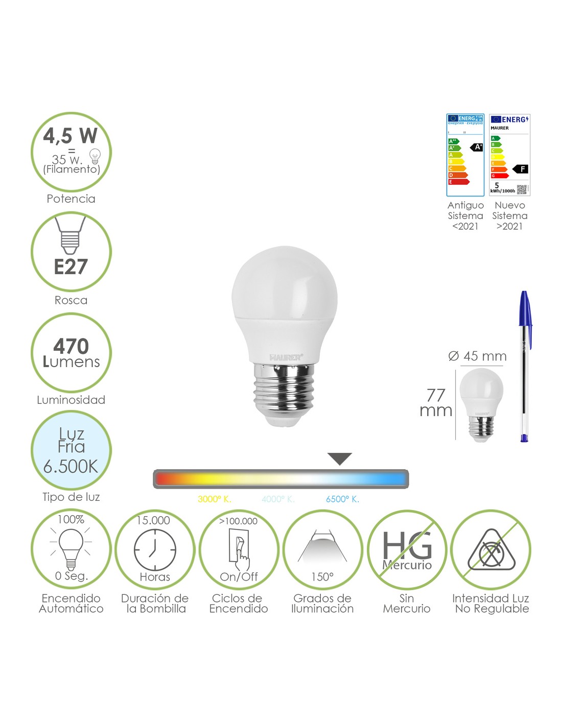 - Potencia: 4.5 W. equivalente a 55 W. aproximadamente de antigua incandescencia.