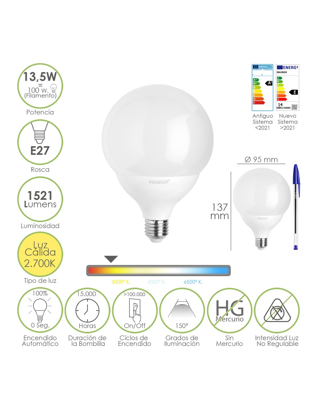 Bombilla Led Esfera Globo E27. 13,5 Watt. Equivale A 100 Watt. 1521 Lumenes. Luz Calida 3000º K.
