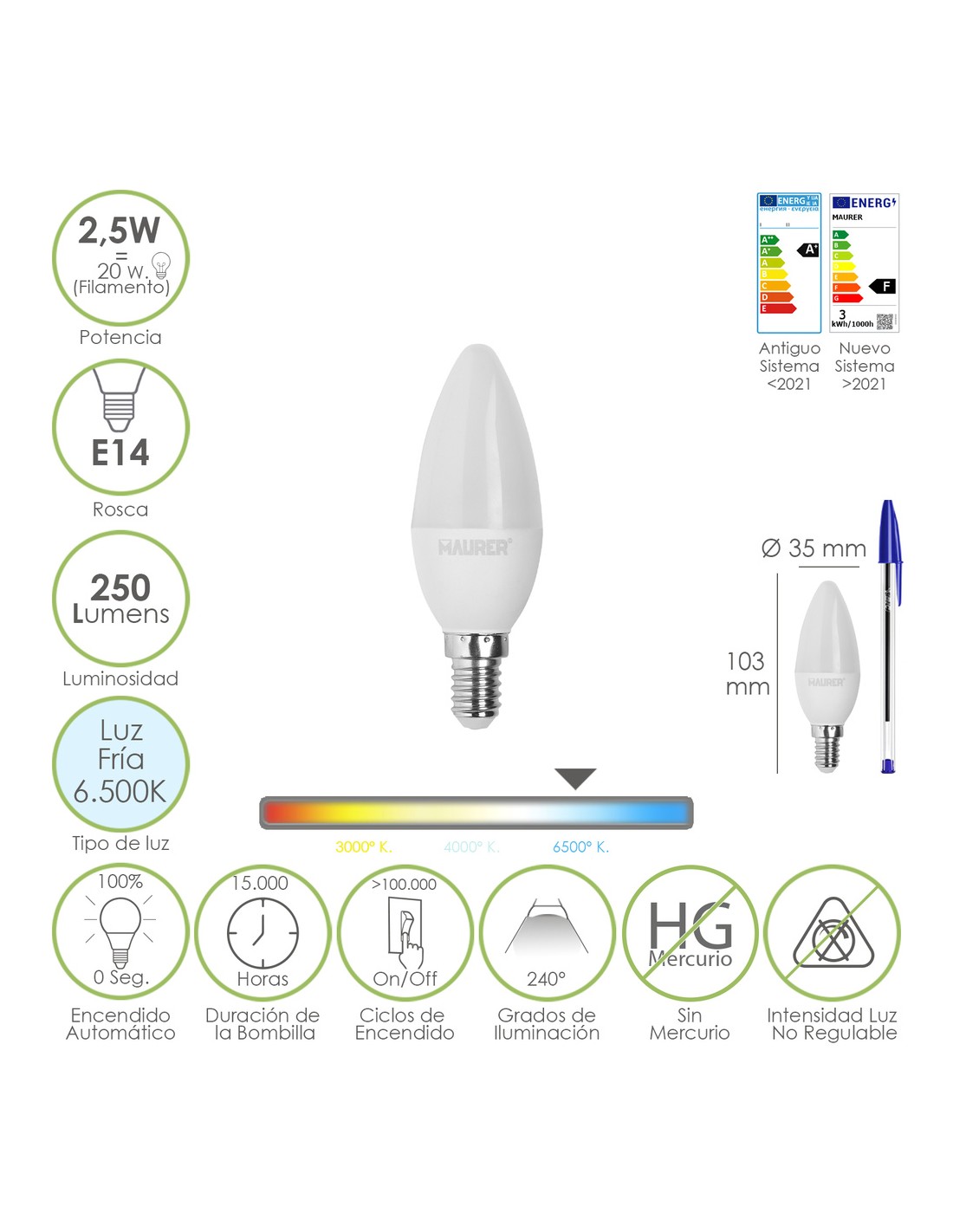 Bombilla Led Vela E14. 2,5 Watt. Equivale A 20 Watt. 250 Lumenes. Luz Fria 6500º K.