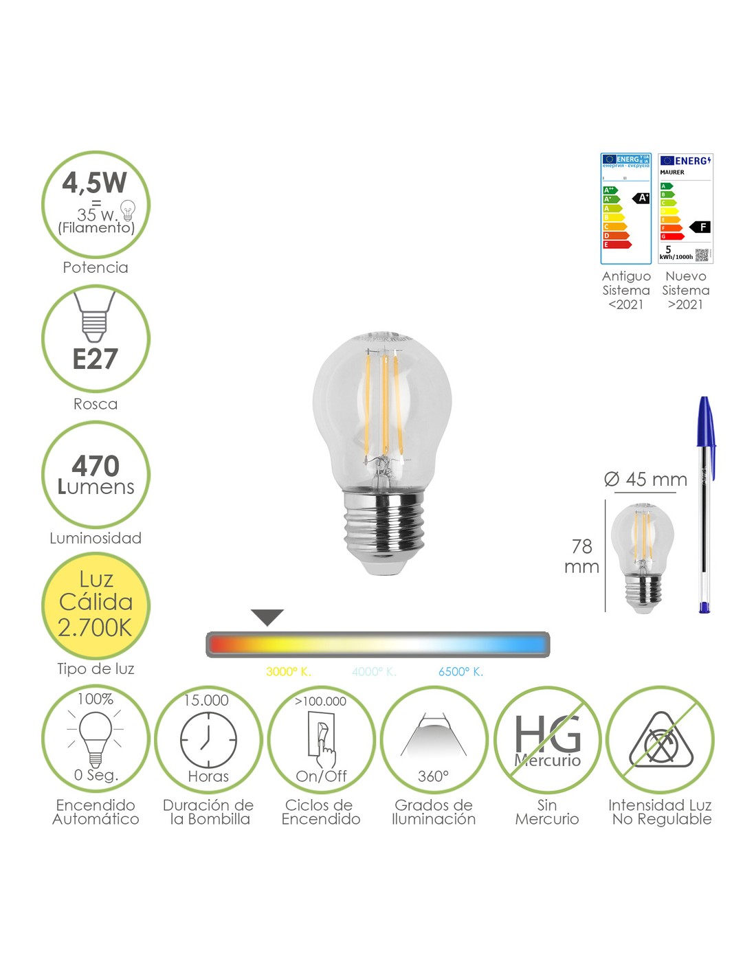 - 2700º K. (Kelvin), Luz calida, luz luz amarilla. 470 lúmenes. Haz / apertura de luz: 360º